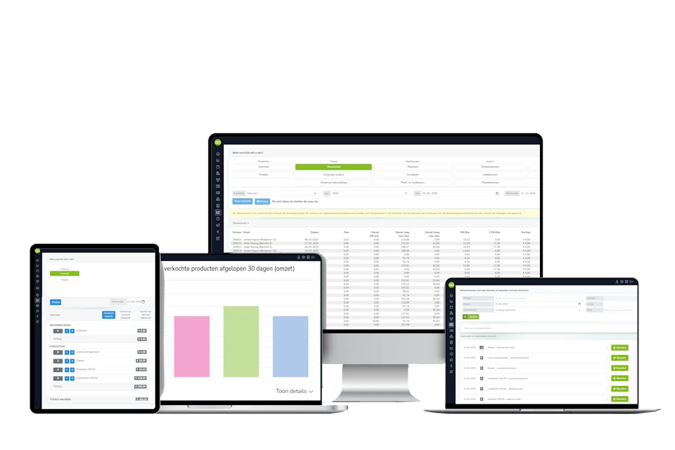 We bieden een alles-in-één software oplossing, inclusief de optie voor een geïntegreerd boekhoudsysteem. Het regelt afspraken, klantbeheer, voorraden, boekhouding en meer, allemaal in één systeem! Super handig voor salons om alles makkelijk te managen!