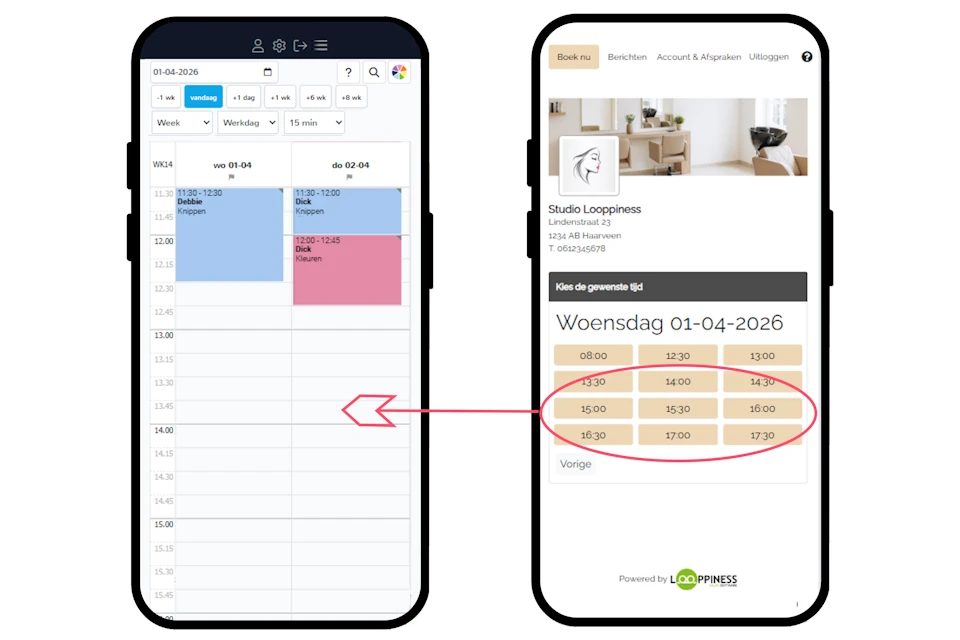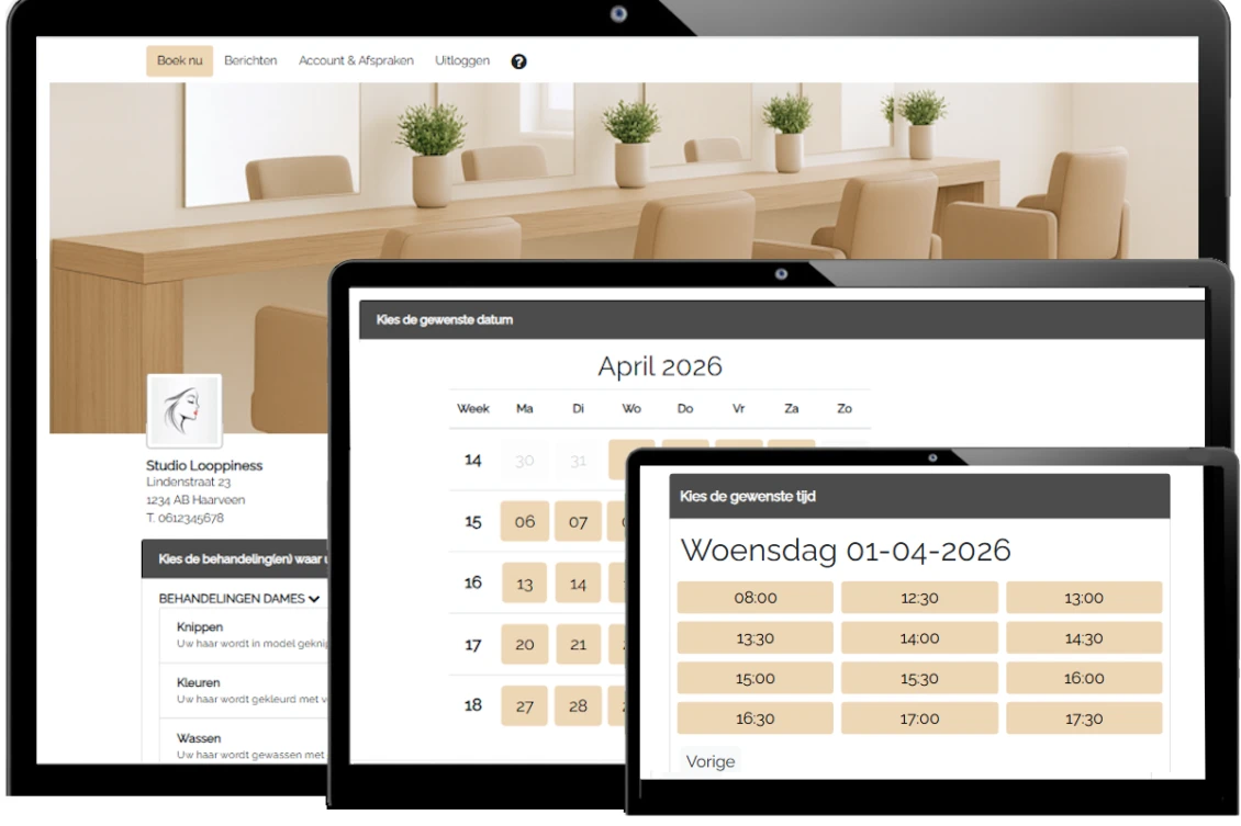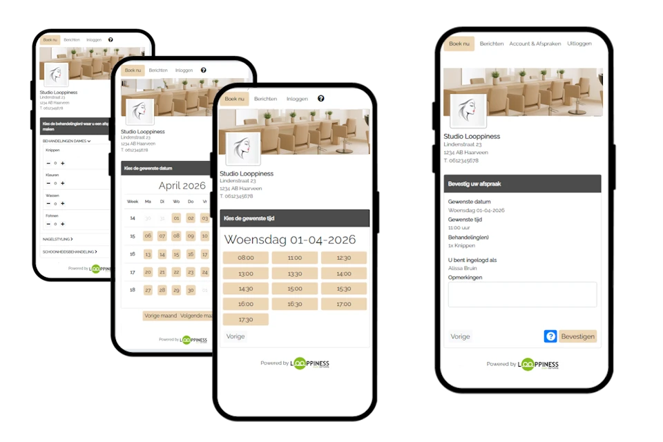 Met het online boekingssysteem voor salons van Looppiness kunnen klanten op elk moment afspraken maken, zelfs buiten jouw openingstijden. Hierdoor is jouw salon altijd bereikbaar!