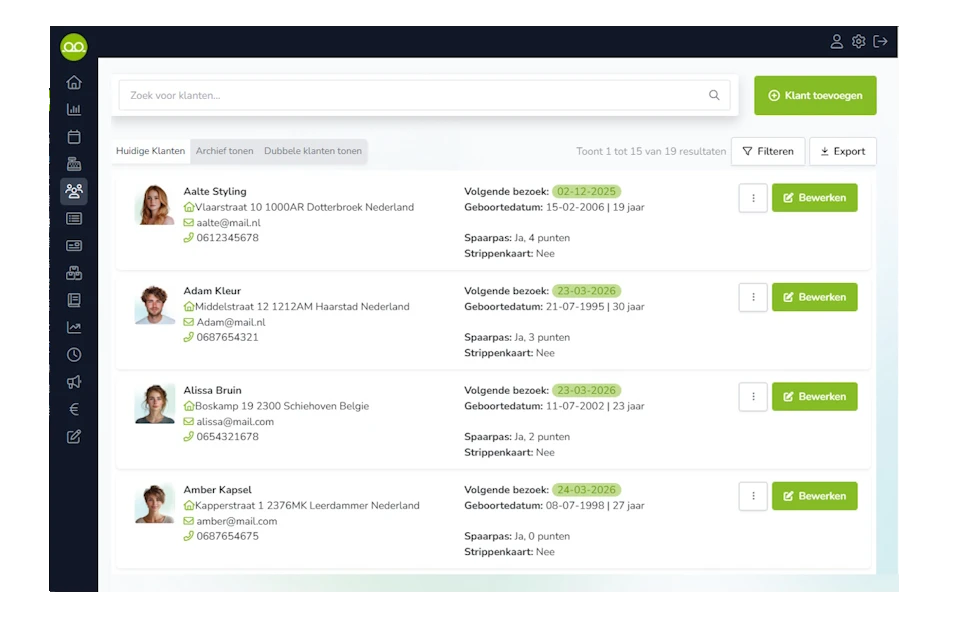 Zo heb je snel toegang tot belangrijke gegevens, wat het eenvoudiger maakt om afspraken te beheren, herinneringen te versturen en klanten een persoonlijke ervaring te bieden.