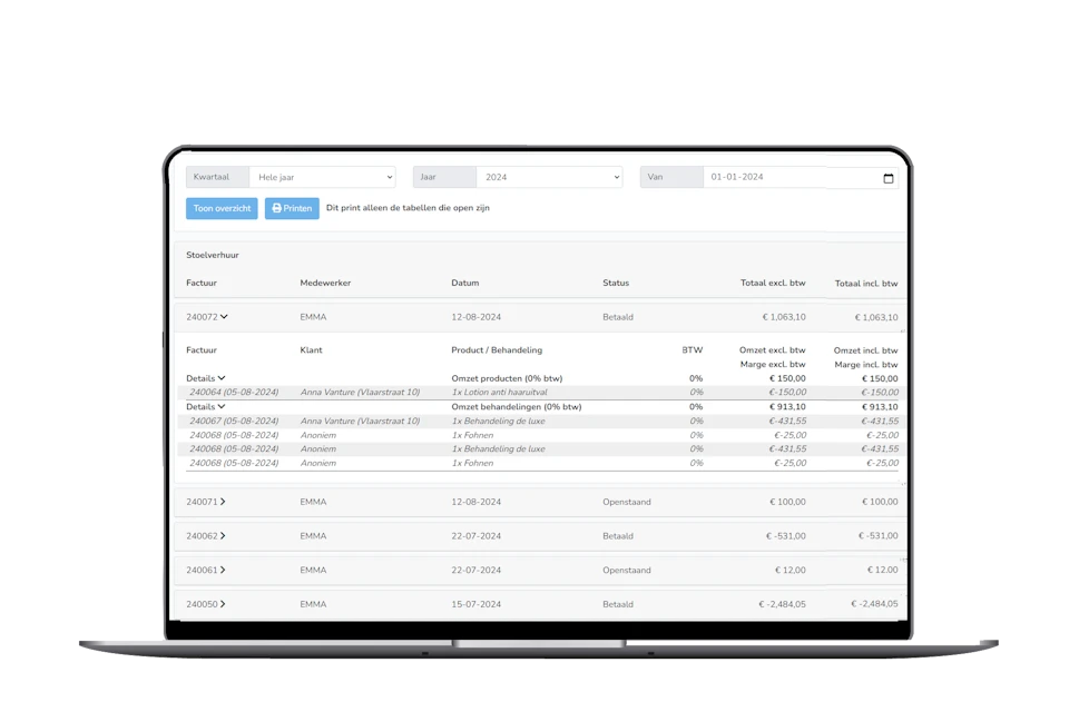 Met rapportages over stoelverhuur krijg je inzicht in prestaties, inkomsten en bezetting. Volg trends, analyseer resultaten en optimaliseer je strategieën om je salon efficiënter te runnen.