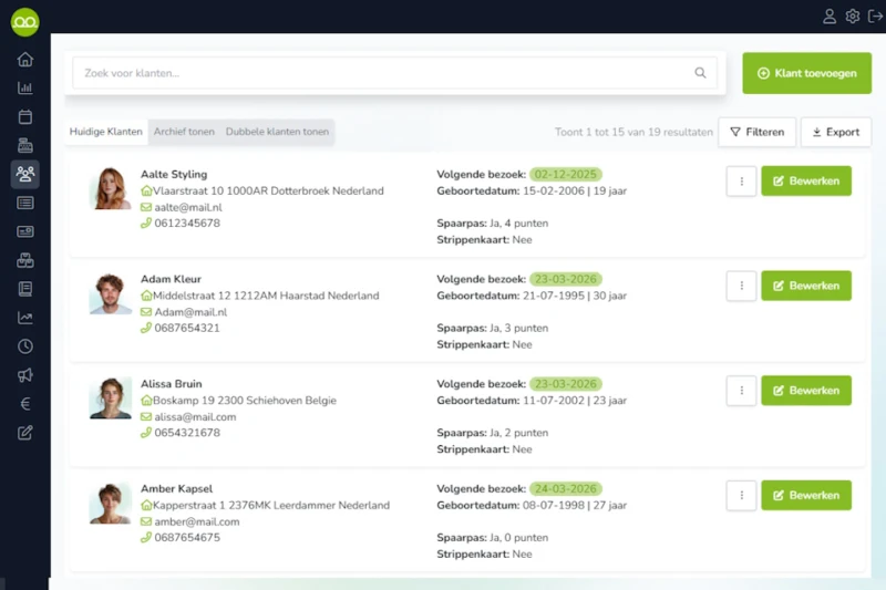 Houd gedetailleerde klantprofielen bij, inclusief behandelingsgeschiedenis en voorkeuren. Dit stelt je in staat om gepersonaliseerde service te bieden en de klanttevredenheid te verhogen.