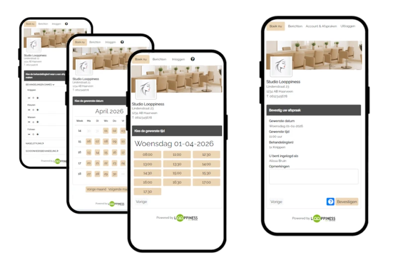 Met Looppiness kunnen klanten van je schoonheidssalon eenvoudig online afspraken boeken. Het systeem toont realtime beschikbaarheid, zodat klanten direct een geschikt tijdstip kunnen kiezen.